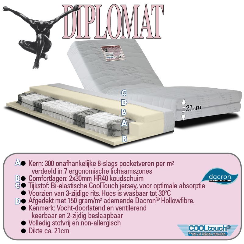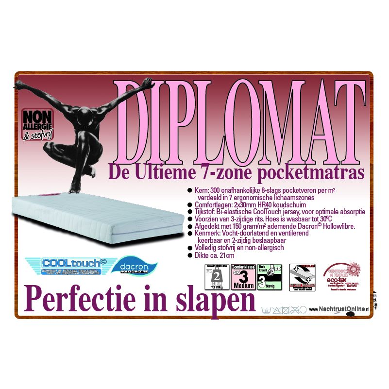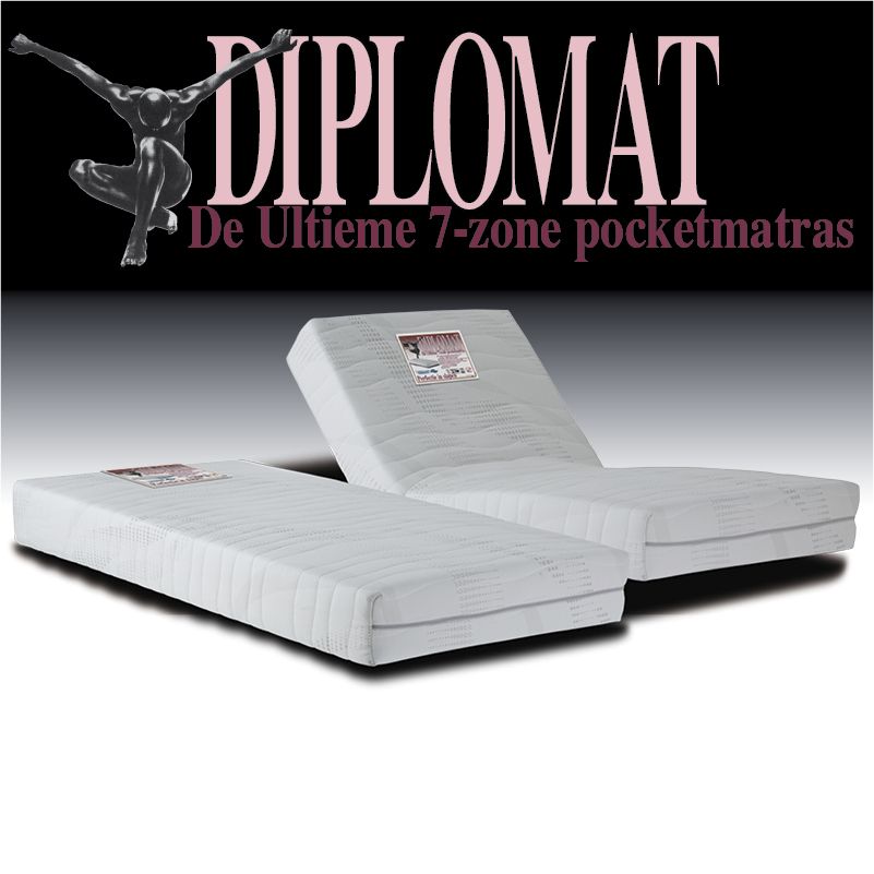 De ultieme 7-Zone pocketmatras Diplomat© is een luxe interieurmatras met krachtig en elastisch Coldfoam HR40 aan twee kanten afgewerkt. Diplomat geeft optimale lichaamsondersteuning voor een gezonde nachtrust. Pocketmatras Diplomat is volledig Non-Allergisch en stofvrij door afritsbare en wasbare tijk. Een formidabel comfort, nu voor hele lage prijzen…
