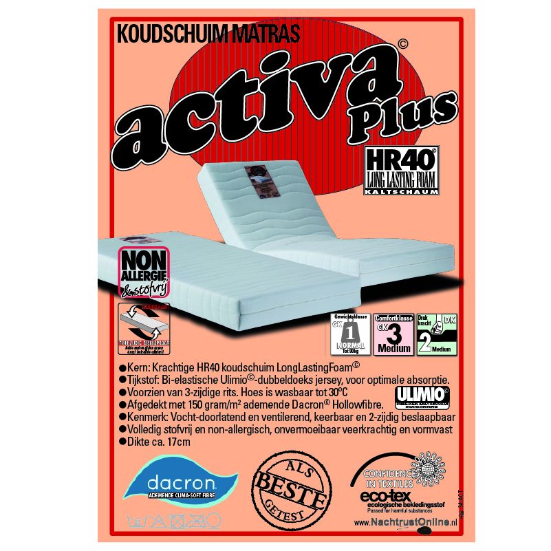 Activa Plus©; Het heerlijke koudschuim matras van krachtige en elastische HR40 Longlasting-Foam (High Resilient ColdFoam). De schuifvrij doorstikte tijkstof van bi-elastische Ulimio-dubbeldoeks jersey (eco-tex) is afritsbaar en wasbaar op 30oC. Afgedekt met ademende Dacron© Hollowfibre.