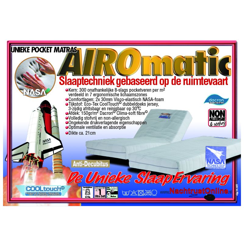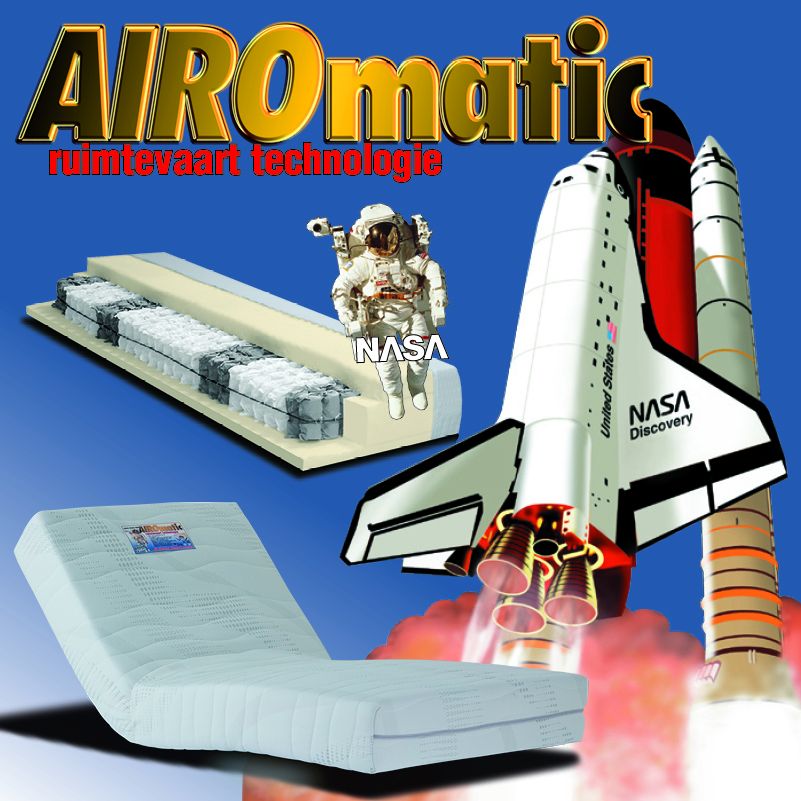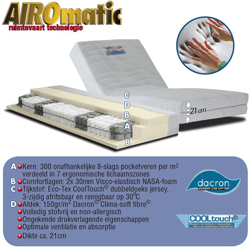 Nasa Pocketveren Matras AIRO-matic©. Unieke ruimtevaart matras voor de ultieme slaapervaring! De pocketveren matras AIRO-matic heeft een interieur van 300pocketveren per m2, in 7 lichaamszones verdeeld. Daardoor ontstaat een uitmuntende ondersteuning en een hoog ventilerend en ademend vermogen, voor een avontuurlijke slaapervaring. De afwerking van de Airo-matic is met royale visco-elastische Nasa-foam lagen, die de energie van het lichaam absorberen en warmte reguleren. Door deze ruimtevaart-techniek ontstaat een ligcomfort, dat op zweven lijkt! U voelt nauwelijks meer enige druk, het lichaamsgewicht wordt subliem verdeeld en u slaapt rustig en enorm ontspannen. De open celstructuur zorgt voor ventilatie en voorkomt vochtophoping. Geadviseerd gebruik tot ca. 110kg (gewichtsklasse 2).