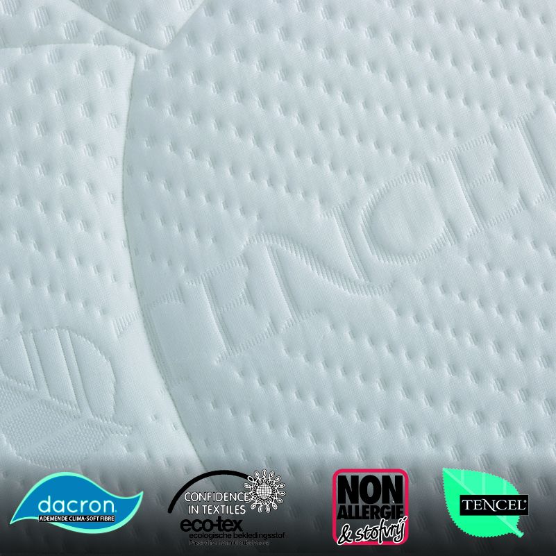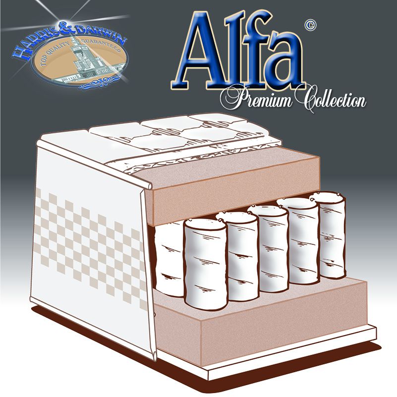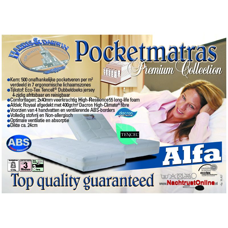 Pocketmatras Alfa uit de befaamde Harris&Darwin Premium©-collectie. Luxe pocketveren matras met krachtig HR55 koudschuim aan twee kanten afgewerkt. De edele kern met 500 onafhankelijke Micro-pocketveren per m2 (8-slags thermsich gehard High-carbon steel) verdeeld in 7 ergonomische lichaamszones, steunt het lichaam uiterst genuanceerd, en geeft een enorm comfort. Luxueus afgewerkt met originele, natuurlijke Tencel© bekledingsstof met uitmuntende eigenschappen. Voorzien van 4 praktische handvatten en ademende 3D ABS-borders. Voor een overweldigende slaapervaring.