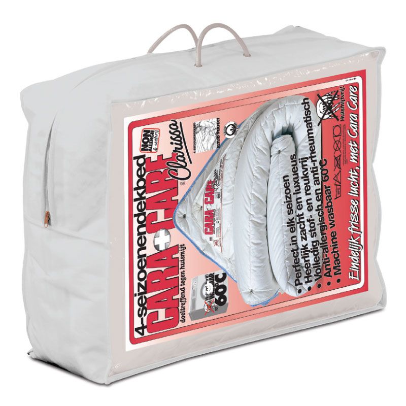 De unieke Clarissa-vulling is door de microporeuze vezelstructuur in staat om enorme hoeveelheden lucht vast te houden. Hierdoor ontstaat een excellente warmte-isolatie. Bovendien neemt de vezel ons transpiratievocht snel op en staat het direct aan de buitenlucht af. De speciaal ontwikkelde tijkstof is van 100% puur (Sanforized©) katoen. Het is dus uitstekend ademend, maar ook machine-wasbaar tot 90°C. Zo krijgt huismijt geen kans. Het Cara Care 4-seizoenen dekbed Clarissa© is het ideale dekbed, voor mensen die last hebben van stofallergieën.