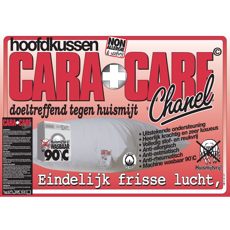 Het unieke CARA-CARE-Chanel kussen geeft een krachtige ondersteuning, en vormt zich plezierig naar elke slaaphouding. Bovendien is dit perfecte kussen volledig stof- en reukvrij, en is machine wasbaar tot 90°C, voor de broodnodige hygiëne. De dichte tijkstof is van 100% gesanforiseerde katoen, dus goed ademenden huidvriendelijk. Kortom; het ideale hoofdkussen voor mensen die last hebben van sterke stof-allergieën en huismijt. Dit hoofdkussen is in dikte aanpasbaar aan uw persoonlijke slaapwens, door rits en losvlokkige vulling. CARA-CARE is ontwikkeld volgens de hoogste kwaliteit- en comfortnormen. Heerlijk en rustig slapen met materialen die volledig reuk- en stofvrij zijn.