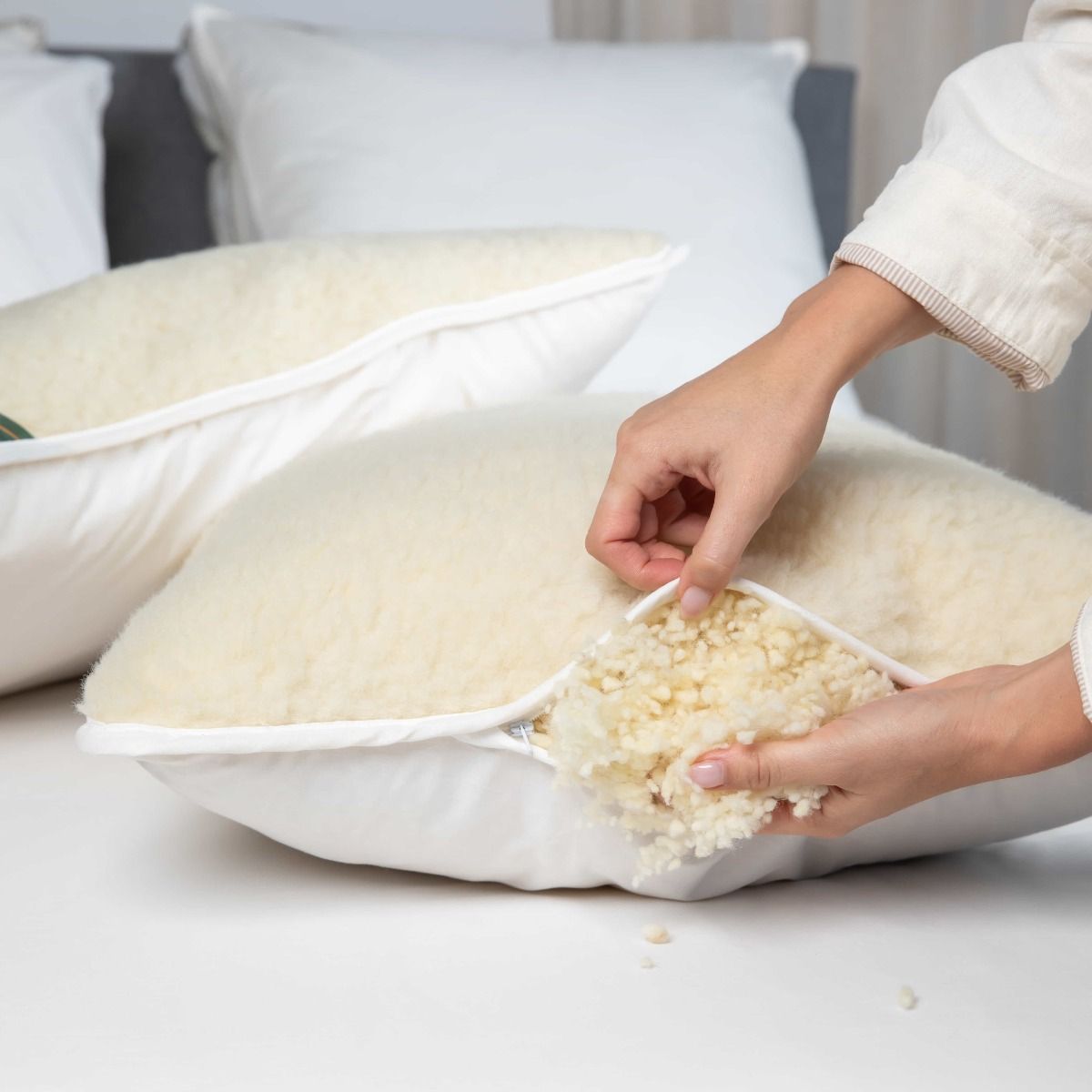 Gevuld met fijne zuiver scheerwollen wolbolletjes. De extreem gekroesde wol-kwaliteit zorgt niet alleen voor optimale ondersteuning, maar ook voor ’n luxe laag van miljoenen luchtkussentjes, die zorg dragen voor optimale ventilatie, onovertroffen vochtregulatie, een unieke warmtespreiding en adembenemend luxueus comfort. De pure scheerwol wordt zo behandeld, dat alle natuurlijke ingrediënten (zoals de heilzame Lanoline) behouden blijven, zodat de unieke werking van wol volledig gehandhaafd blijft.