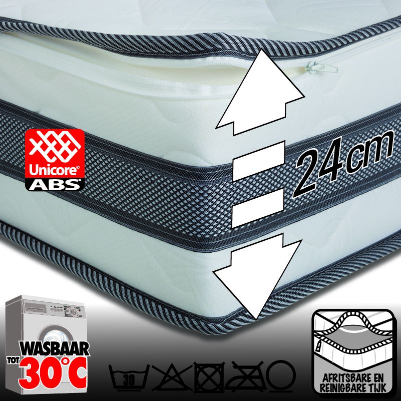 Bijzonder hygienisch en fris; volledig stofvrij, hyperallergeen en non-allergisch. Optimale ventilatie en absorptie. Met enorme kracht en levensduur speciaal voor de zwaardere slaper (tot ca.130kg)