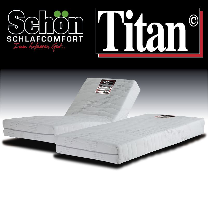 Titan© is de uiterst veerkrachtige HR55 koudschuim (High Resilient ColdFoam) LongLastingFoam© matras met een bijzonder lange levensduur. De speciale, heerlijk frisse CoolTouch© tijkstof (eco-tex) is afritsbaar en wasbaar op 30oC, en is rijkelijk afgedekt met 200gr/m2 ademende Dacron© High-Climat fibre. Titan© is onvermoeibaar veerkrachtig, vormvast en onbeperkt buigzaam. Ademend, elastisch en ventilerend.